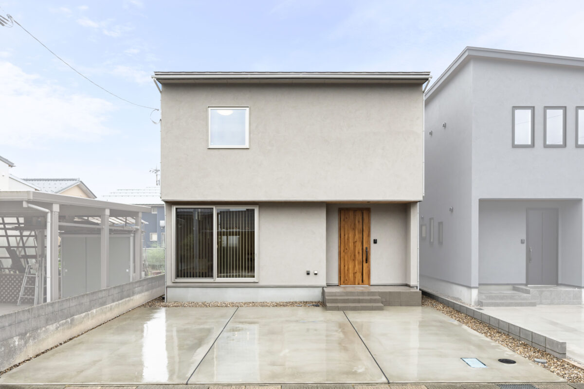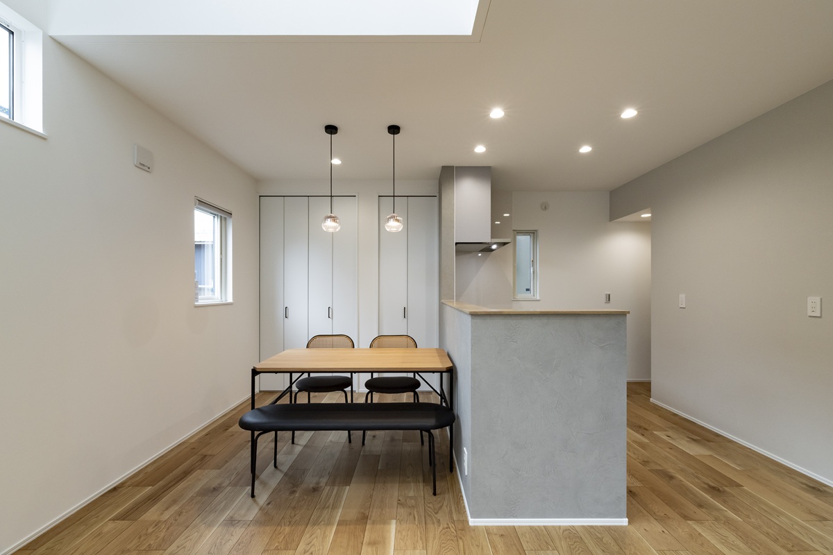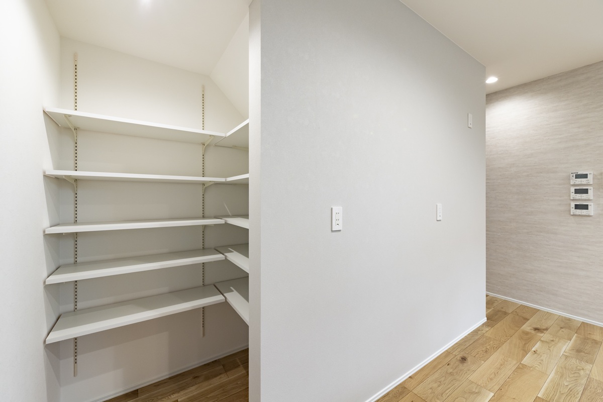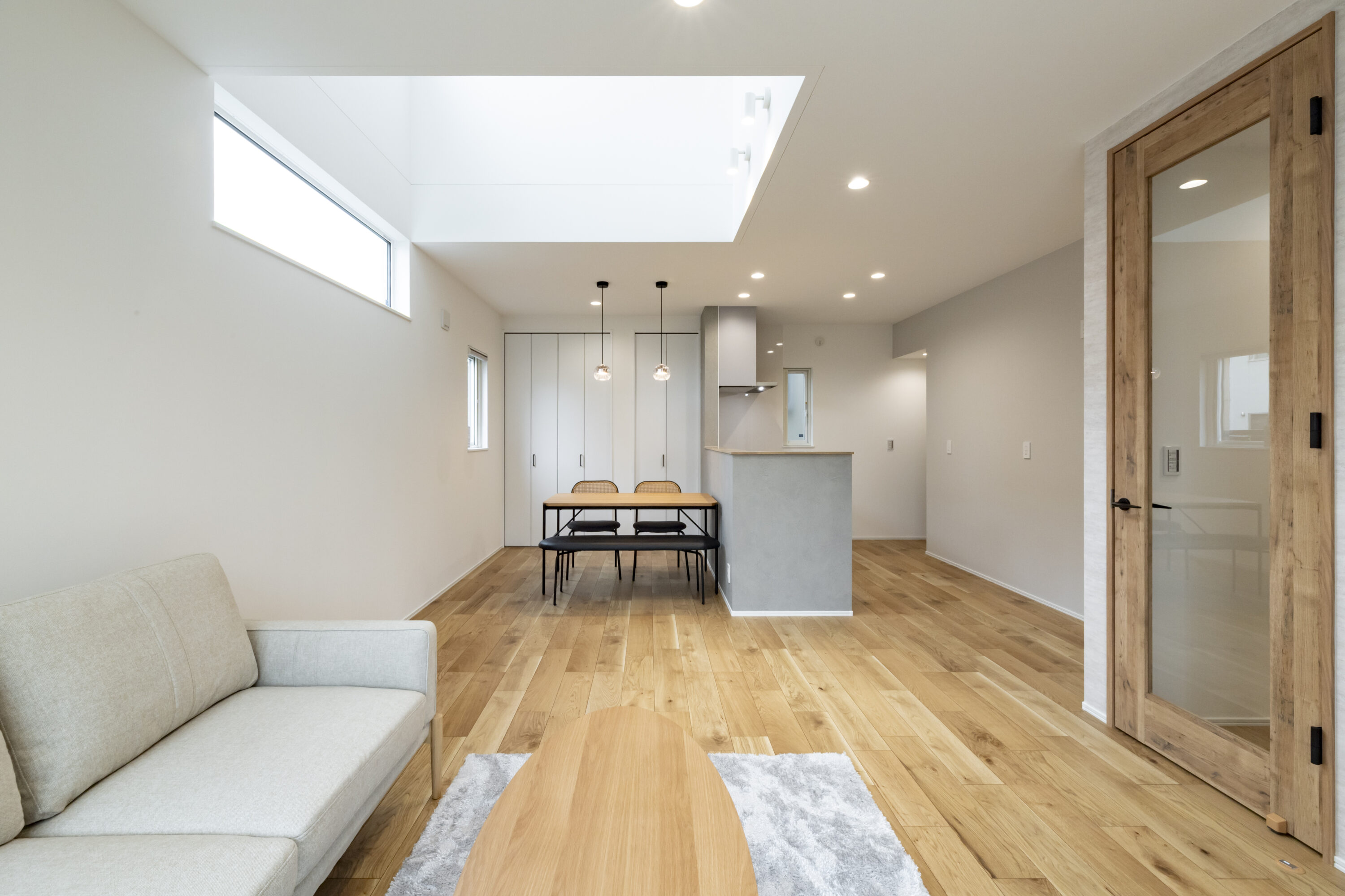 本体価格 1,980万 ・2F-4Aプラン ・間取り 3LDK ・建物面積 97.29㎡ TAG #ランドリールーム #吹抜け #スタイリッシュ 塗り壁と木板コントラスト 大開口窓 キッチン裏、階段下スペースを生かしたパントリー 洋室 4畳の大型WIC